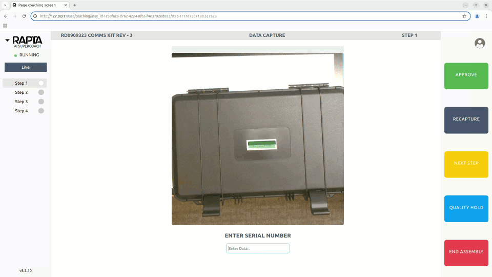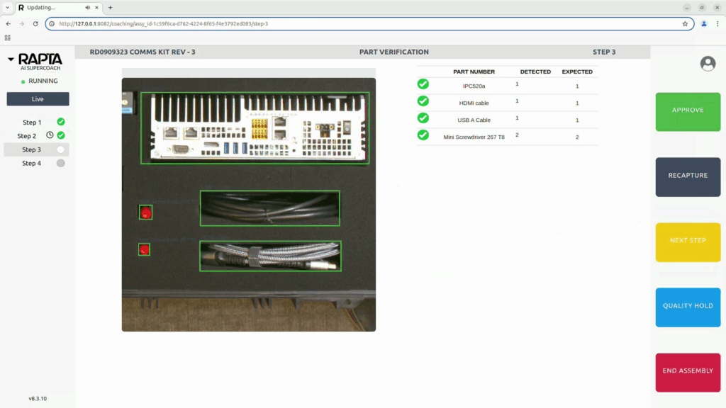 Rapta’s Part Verification feature uses high accuracy vision systems to automatically identify and count components during critical manufacturing checkpoints. Whether validating kitted parts before assembly, verifying piece counts in production totes, or confirming final packed products before shipment, the system compares what’s actually present against expected specifications in real time. This eliminates the manual counting and visual inspection processes that are both time-consuming and prone to human error—especially when dealing with high-mix assemblies or components that look similar.